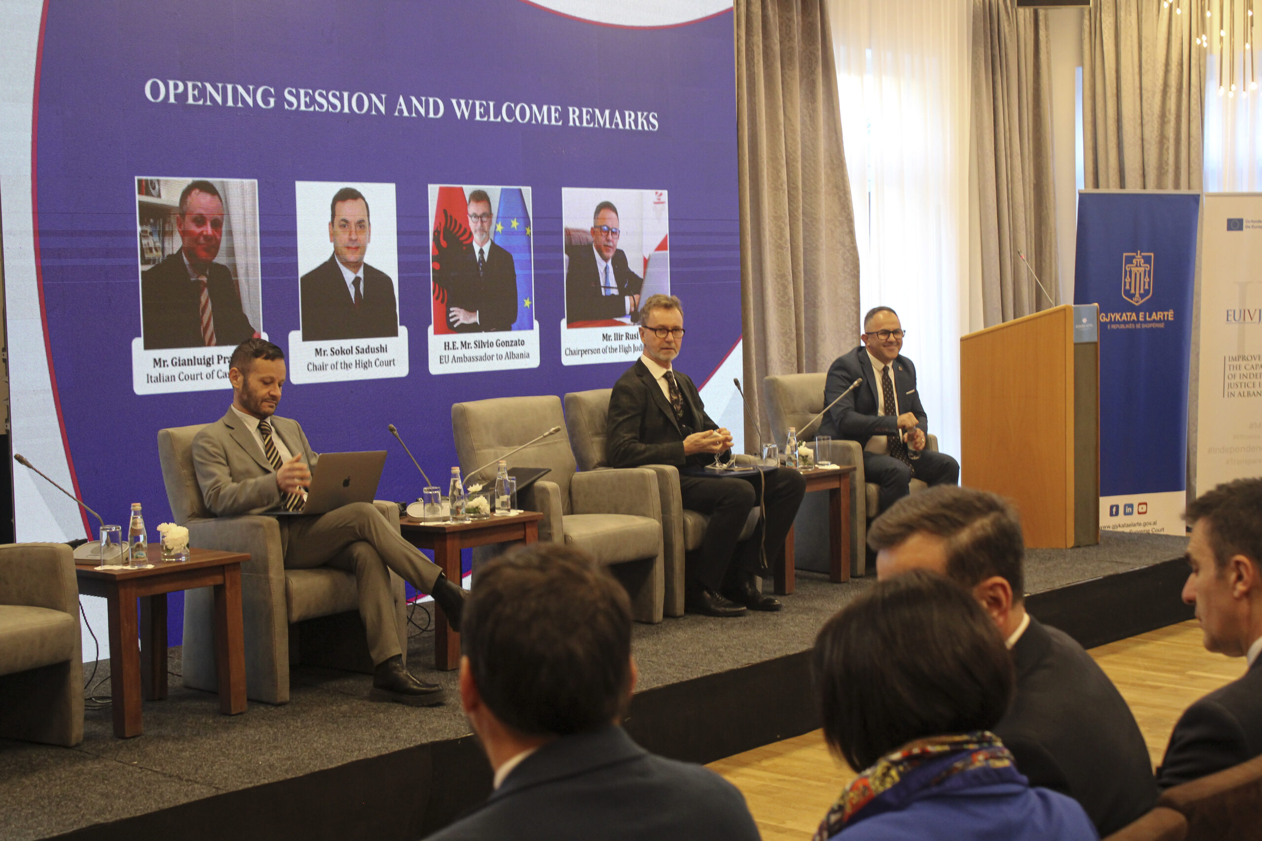 Mr. Ilir Rusi, Chair of the High Judicial Council, highlighted the fact that the role of HC is decisive in unifying judicial practices. Justice sometimes is relative as it should be given on time to avoid additional overlapped problems. He acknowledged that the most problematic issue is the unfilled vacancies and shared the information that the HJC now has created a WG which will assess all the needs to increase the number of magistrates to reduce the backlog in courts. Mr. Rusi made a remark on the lack of physical infrastructure as a requirement by the justice reform which now is in its 3rd phase. HJC will try to improve the working environments for all magistrates in order for them to increase quality in their daily work. The HJC Chair closed his speech by thanking the EU ambassador for his support and the EU4Justice project as well for its support, not only technical but logistical as well.